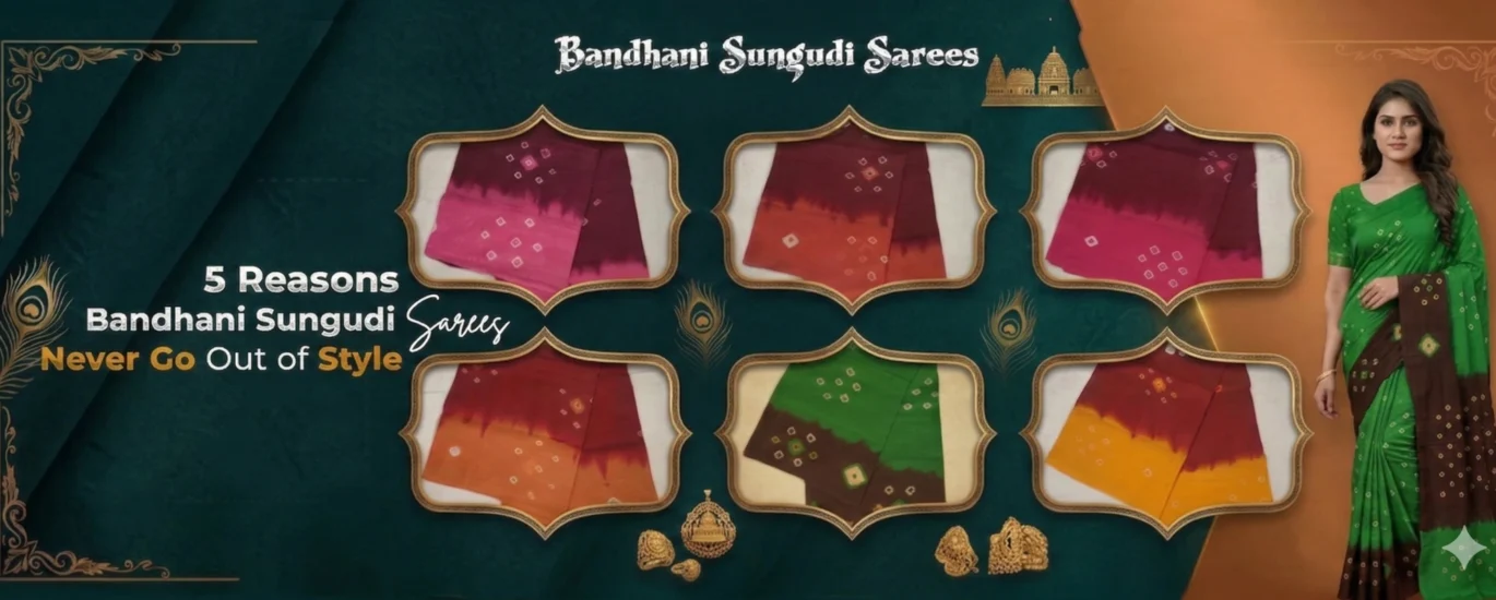 Bandhani Sungudi sarees continue to remain timeless because they beautifully combine heritage craftsmanship, vibrant design, comfort, and versatility. They are more than just garments—they are a celebration of culture, artistry, and enduring elegance. Bandhani Sungudi sarees continue to remain timeless because they beautifully combine heritage craftsmanship, vibrant design, comfort, and versatility. They are more than just garments—they are a celebration of culture, artistry, and enduring elegance.