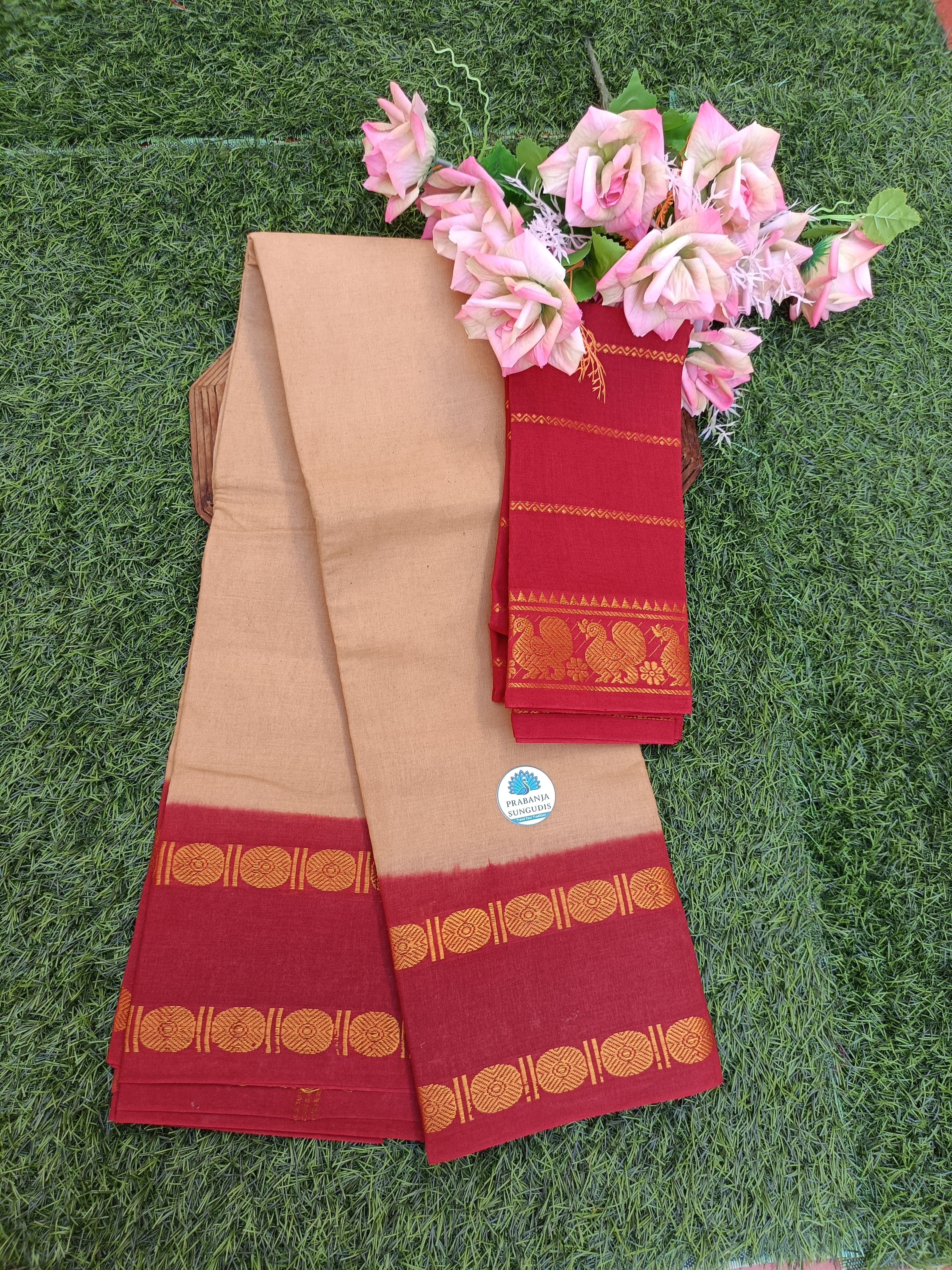 Celebrate the beauty of authentic South Indian handloom with this elegant Rettai Padai Rudraksha Sungudi Cotton Saree. Crafted in a Beige body, this saree is beautifully highlighted with a striking contrast Red double border (rettai padai) with Blouse, adorned with traditional rudraksha-inspired zari motifs.