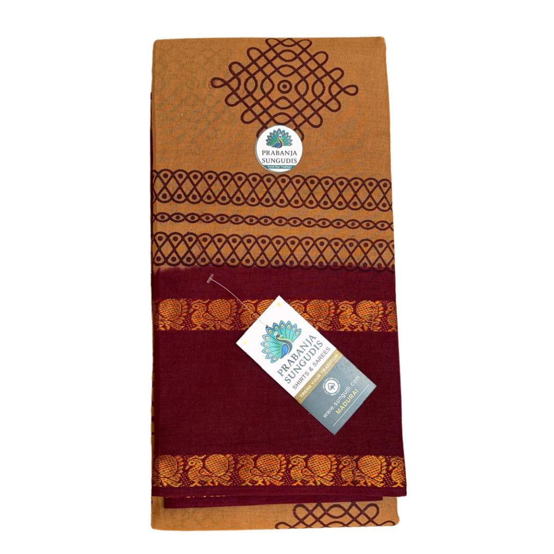 Celebrate timeless South Indian tradition with this elegant Prabanja Sungudi Cotton Saree, beautifully crafted in a Classic Beige base accented by a striking Maroon rettai padai (double border). The saree features classic kolam-inspired geometric motifs, symbolizing heritage and auspiciousness, printed with precision across the body.