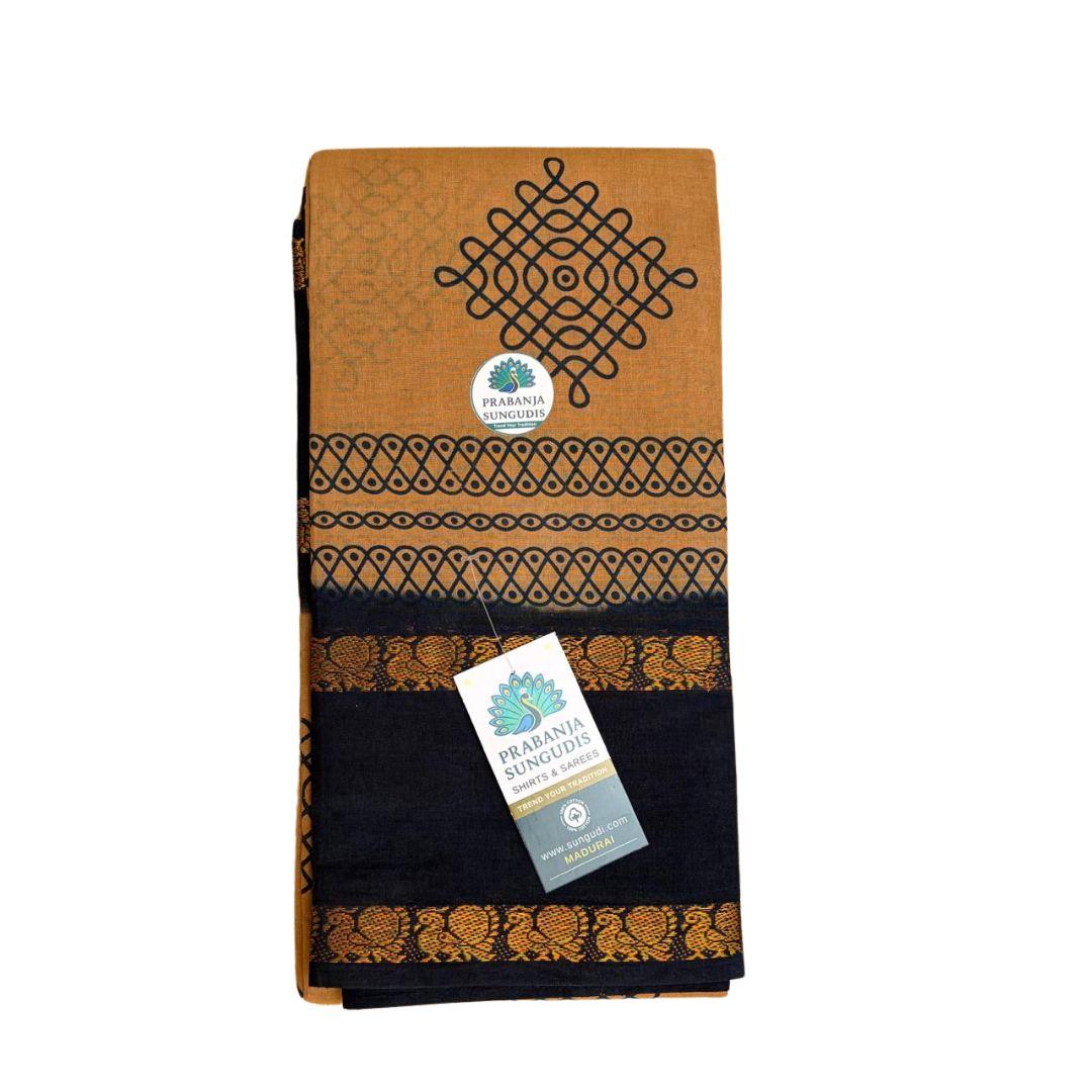Celebrate timeless South Indian tradition with this elegant Prabanja Sungudi Cotton Saree, beautifully crafted in a Classic Beige base accented by a striking Navy blue rettai padai (double border). The saree features classic kolam-inspired geometric motifs, symbolizing heritage and auspiciousness, printed with precision across the body.