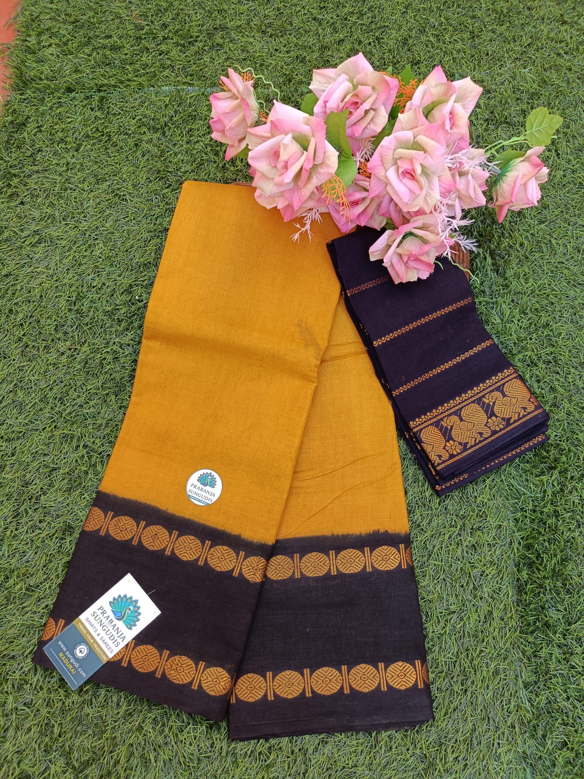 Celebrate the beauty of authentic South Indian handloom with this elegant Rettai Padai Rudraksha Sungudi Cotton Saree. Crafted in a Mustard yellow body, this saree is beautifully highlighted with a striking contrast Black double border (rettai padai) with Blouse, adorned with traditional rudraksha-inspired zari motifs.