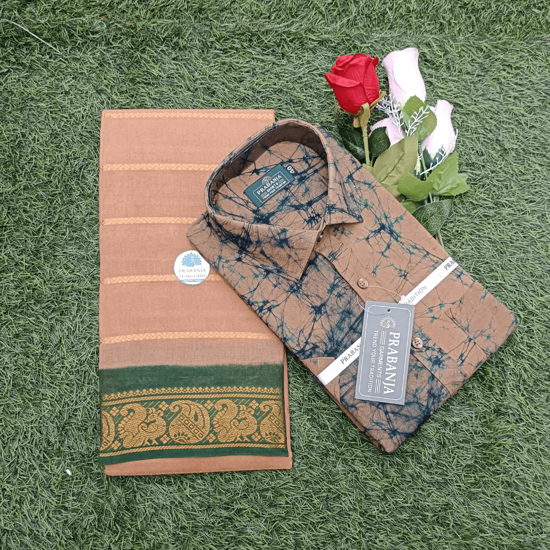 This combo, as shown in the image, features a beautifully designed with traditional borders, paired with a stylish sungudi cotton shirt — a perfect blend of tradition and modern style.