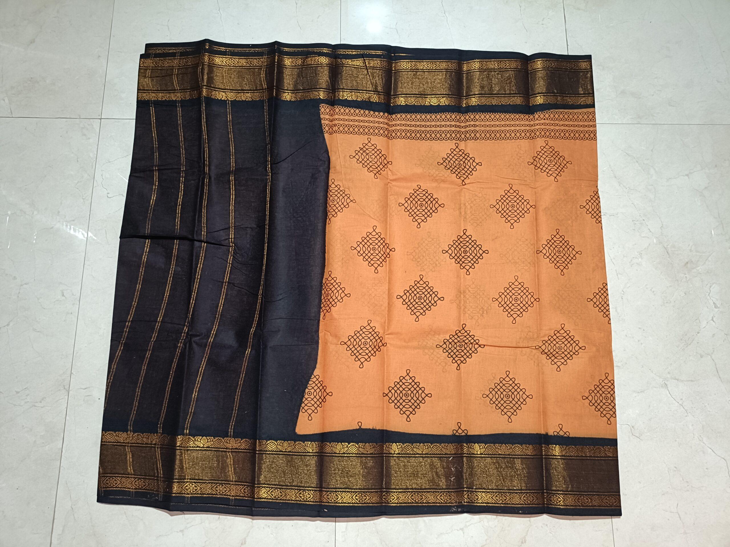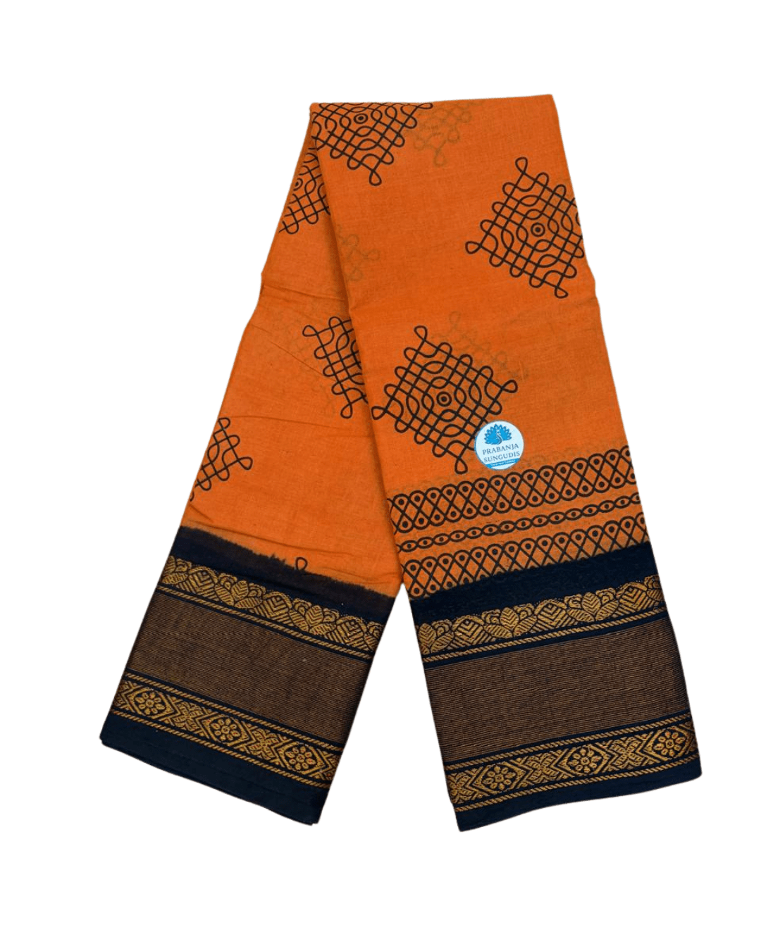 Premium Cotton Fabric: Made from high-quality Sungudi cotton, soft, breathable, and comfortable for all-day wear. Elegant rangoli-inspired Kolam prints that reflect South Indian heritage Rich Zari Border & Pallu. Contrasting maroon border with intricate zari weaving adds a graceful and festive touch Lightweight & Easy to Drape.