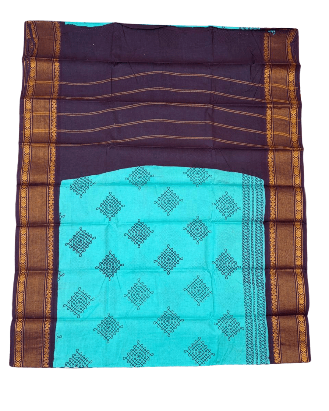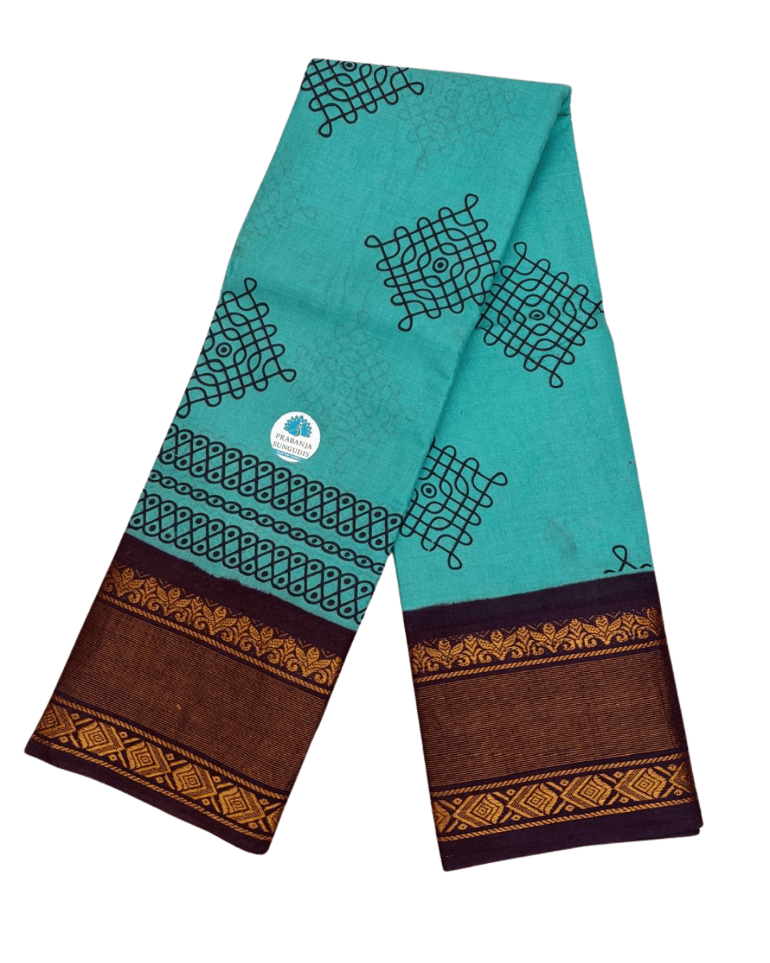 Premium Cotton Fabric: Made from high-quality Sungudi cotton, soft, breathable, and comfortable for all-day wear. Elegant rangoli-inspired Kolam prints that reflect South Indian heritage Rich Zari Border & Pallu. Contrasting maroon border with intricate zari weaving adds a graceful and festive touch Lightweight & Easy to Drape.