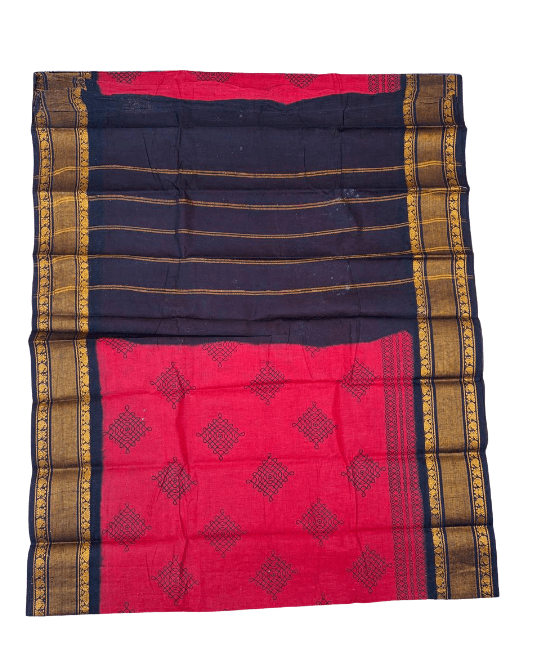 Sungudi Tissue Cotton Kolam Saree | Red and Navy Blue with Gold Zari Border without blouse
