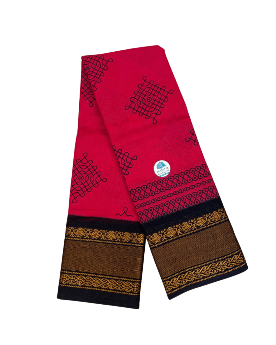 Premium Cotton Fabric: Made from high-quality Sungudi cotton, soft, breathable, and comfortable for all-day wear. Elegant rangoli-inspired Kolam prints that reflect South Indian heritage Rich Zari Border & Pallu. Contrasting maroon border with intricate zari weaving adds a graceful and festive touch Lightweight & Easy to Drape.